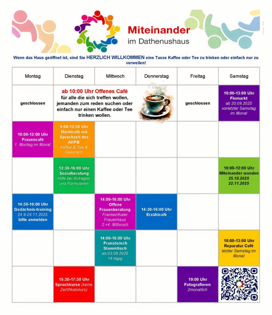 Die Seite des „Miteinander im Dathenushaus“ zieht bald um. Im kommenden Jahr bekommen wir einen neuen Platz auf der Homepage des Protestantischen Dekanats Frankenthal. Dann gibt es auch wieder mehr Informationen von und über das Team im Miteinander.